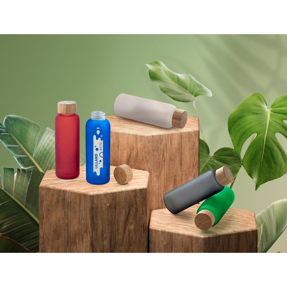 Láhev z matného borosilikátového skla s bambusovým víčkem. Objemem až 500 ml. Dodáváno v dárkové krabičce z kraftového papíru. Protože je výrobek vyroben z přírodních materiálů, barva a velikost výrobku a výsledek tisku se mohou u jednotlivých výrobků lišit. ø65 x 200 mm