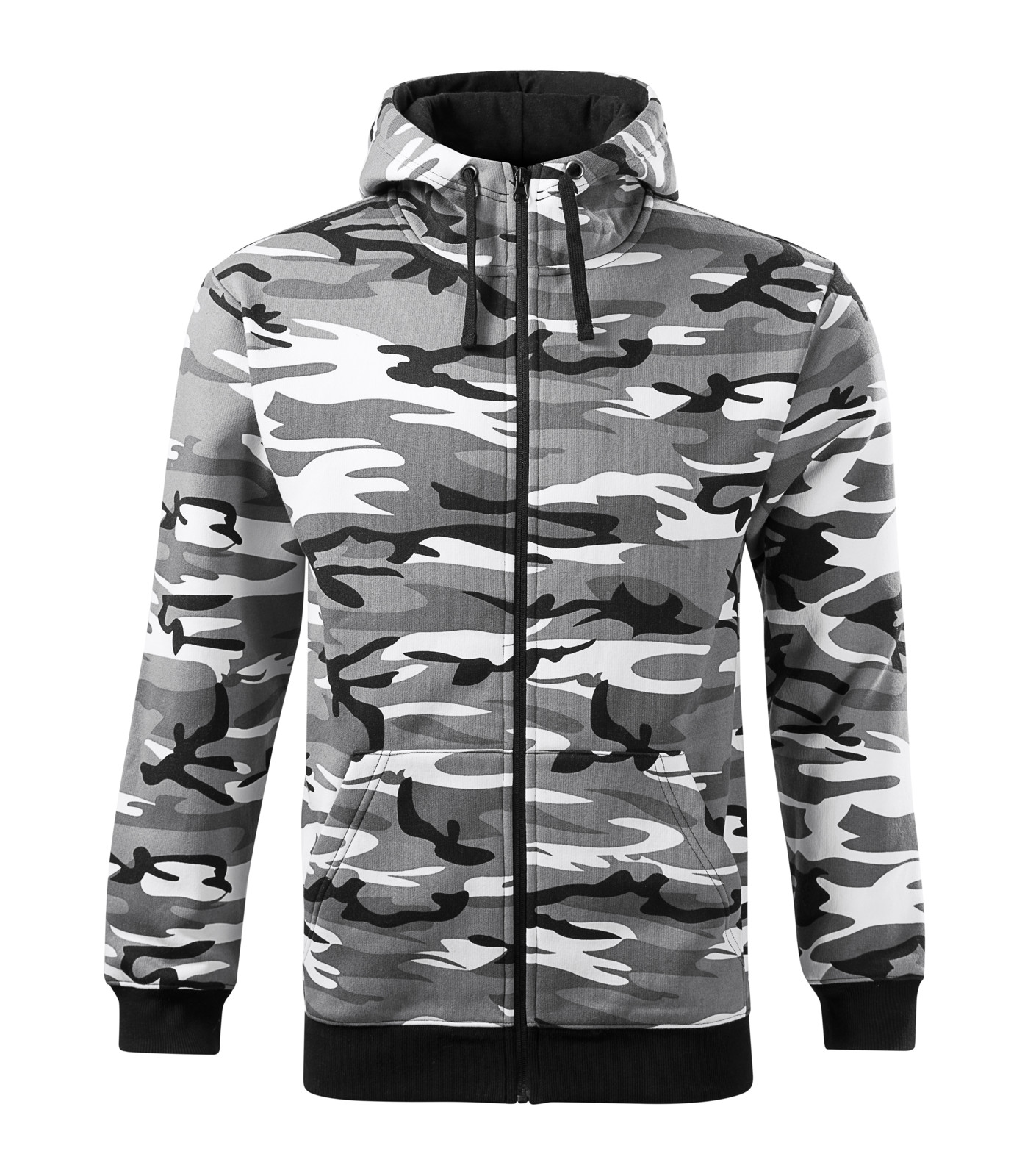 Rovný střih s bočními švy, celopropínací reverzní spirálový zip, kapuce s podšívkou, na stažení šňůrkou, vnitřní část průkrčníku začištěna páskou, nakládané kapsy ve stylu klokanky, dolní lem a manžety rukávů z žebrového úpletu 2:2 s 5 % elastanu, kontrastní prvky, vnitřní strana počesaná