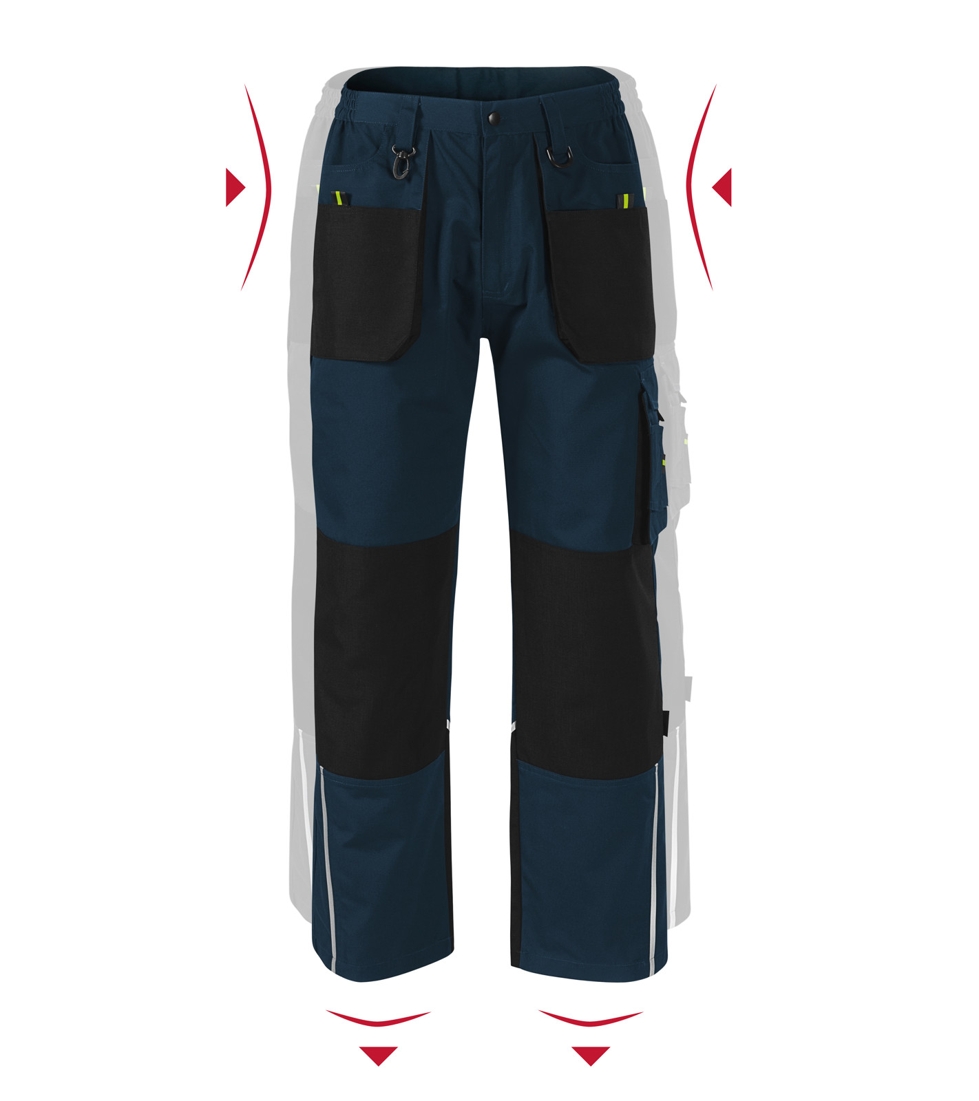 Pruženka v boční části pasového límce, 10 multifunkčních kapes, zdvojený materiál v oblasti kolen, plastové "D" poutko a karabina na klíče a ID karty, poutko na kladivo, dvojité prošití pro vyšší odolnost, vysoce odolný materiál v barvě 01, retroreflexní prvky