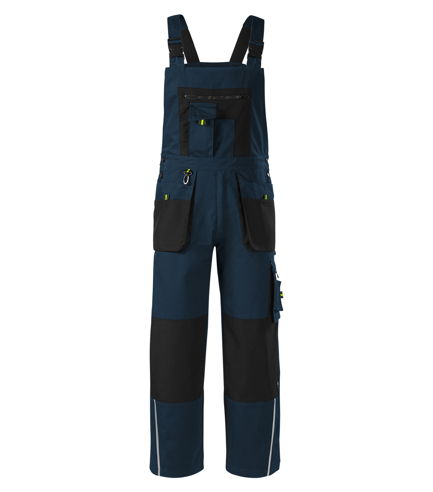 Pruženka v zadní části pasového límce, zapínání na knoflíky v boční části, šle s elastickým dílem nastavitelné přezkou, 14 multifunkčních kapes, zdvojený materiál v oblasti kolen, plastové "D" poutko a karabina na klíče a ID karty, poutko na kladivo, dvojité prošití pro vyšší odolnost, vysoce odolný materiál v barvě 01, retroreflexní prvky