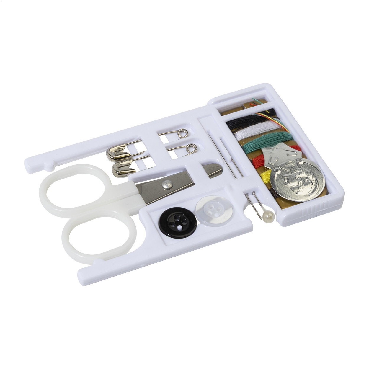 Kompaktní cestovní šicí sada v recyklovaném pouzdře z PS ve tvaru karty. Obsahuje 6 barevných polyesterových nití, nůžky, 2 zavírací špendlíky, 2 jehly, 2 knoflíky a navlékač jehel.