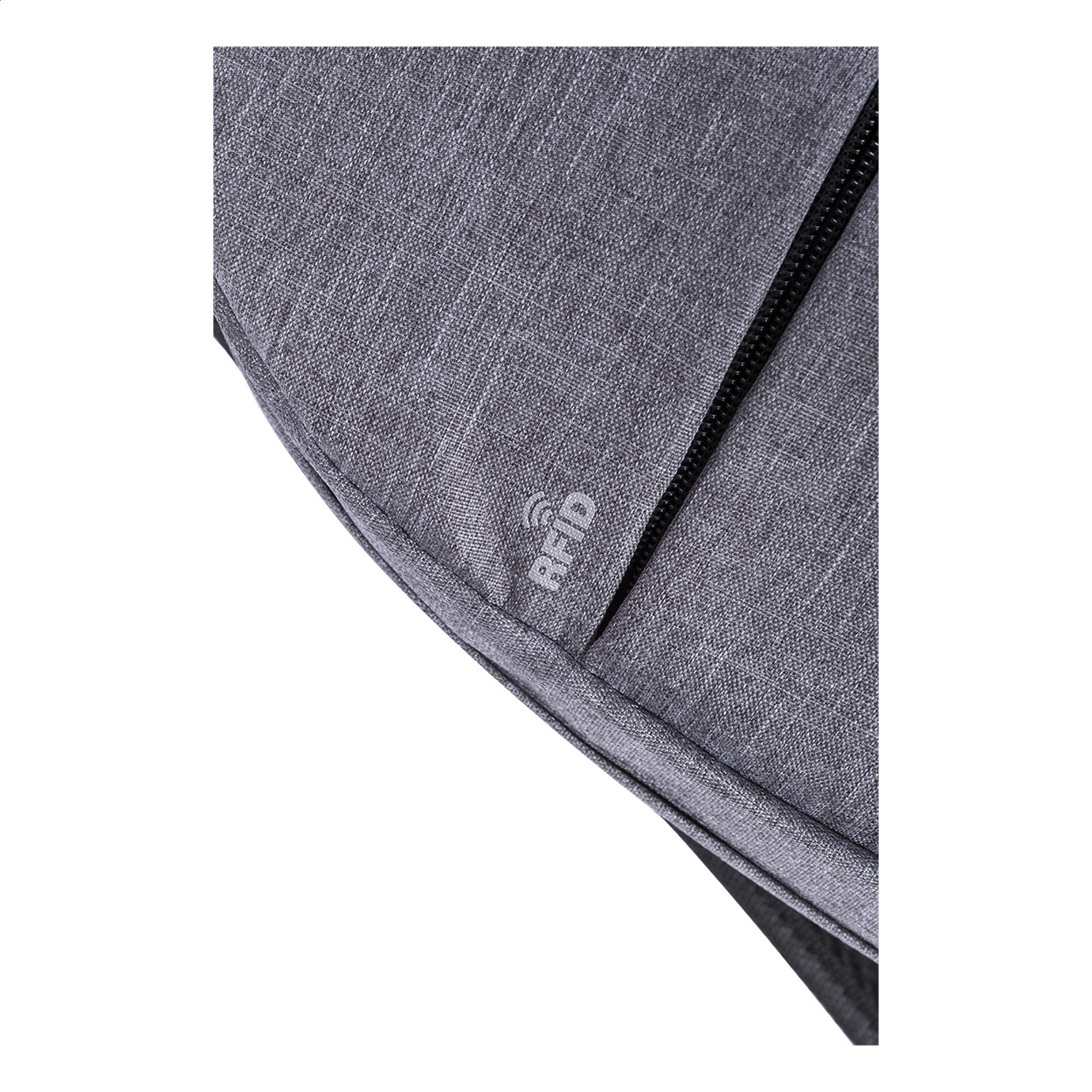 RFID protected backpack with multiple zipped compartments, padded laptop compartment (15"), padded back and shoulder strap. With built-in USB connection for power banks. 300D polyester.