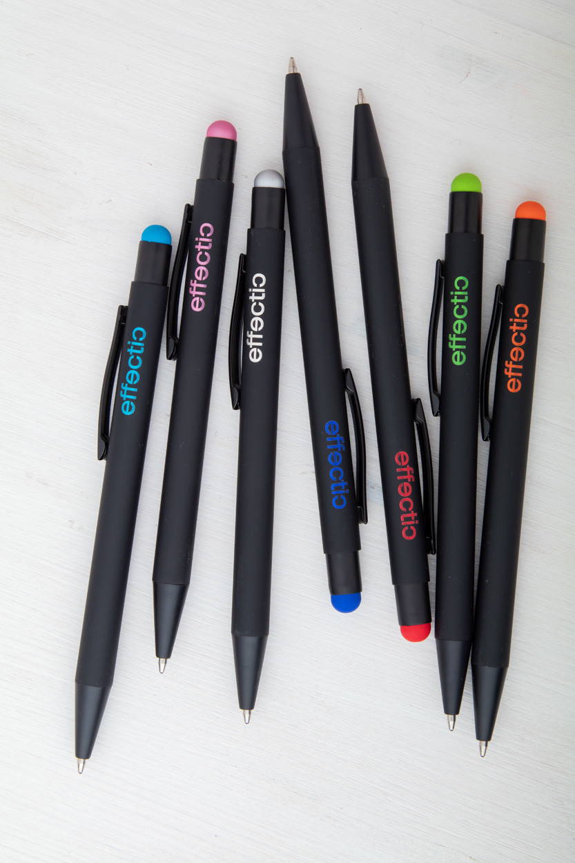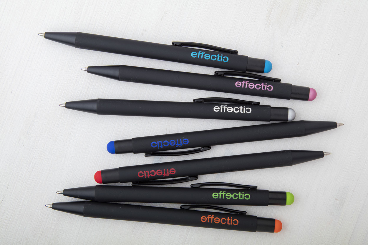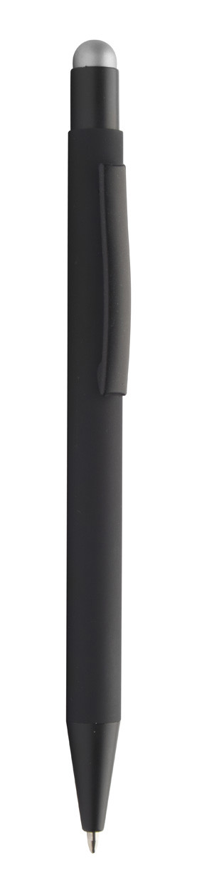 Aluminium ballpoint and touch screen pen with rubberized finish. With special coating for mirror engraving matching the stylus colour. With blue refill.
