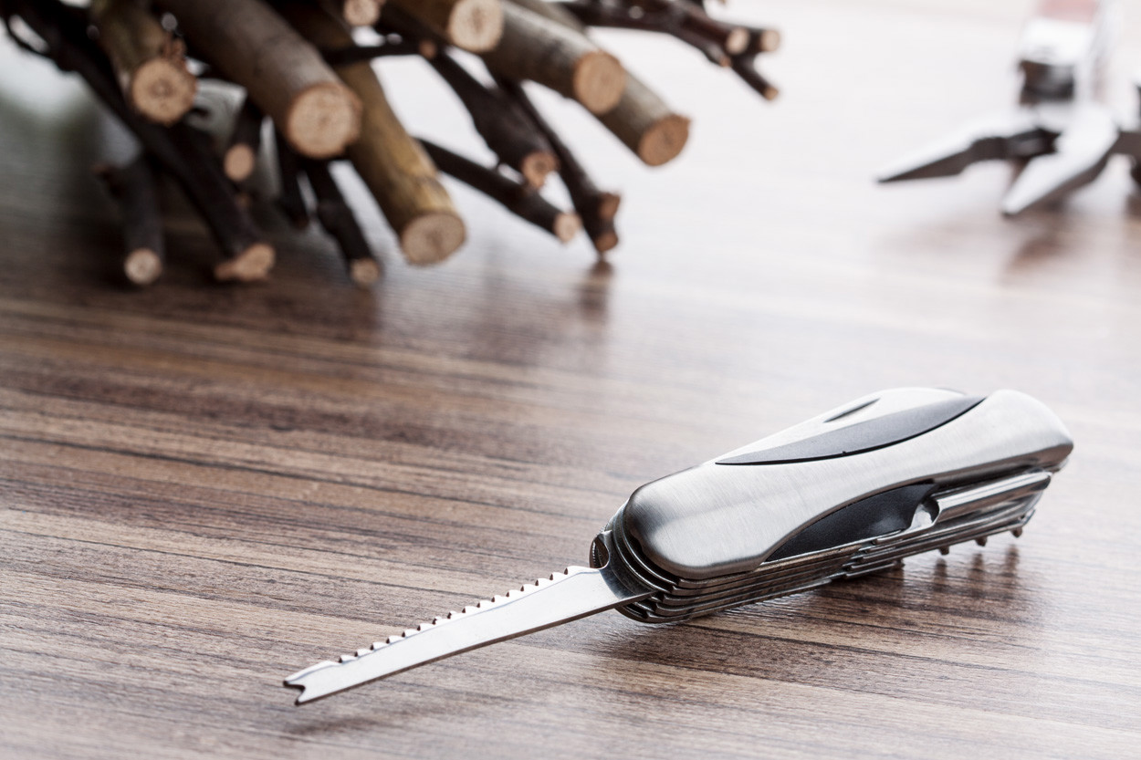 Metal pocket knife with 11 functions and plastic inlay.