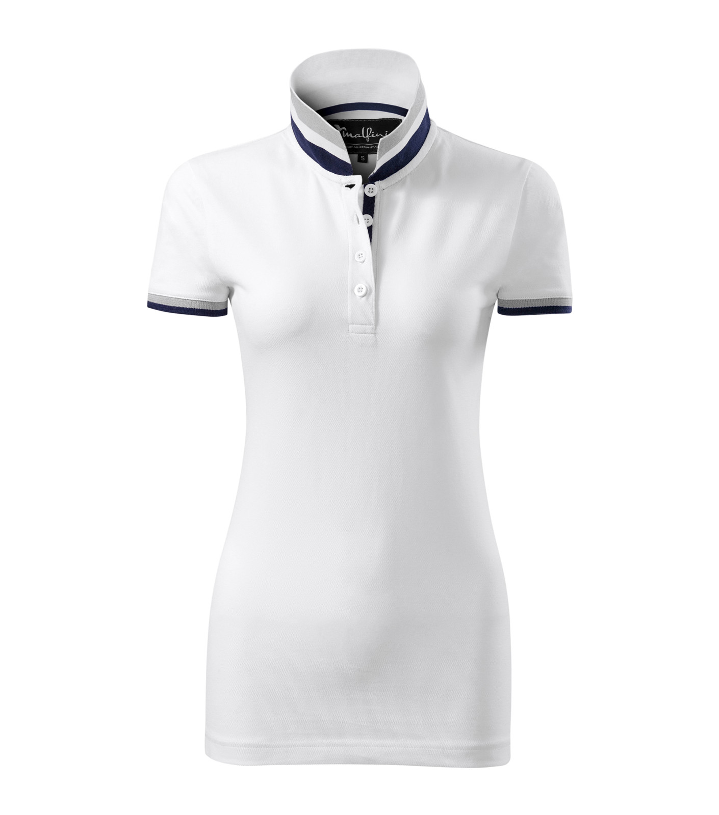 Slight fit cut with side seams, 1:1 rib knit collar and sleeve hems, the lower collar part and sleeve hems with contrast stripes, narrow placket with 4 buttons in the shell fabric colour, slits in the side seams and bottom placket with a contrast tape, inner neckline with a contrast tape, fixing shoulder seams
