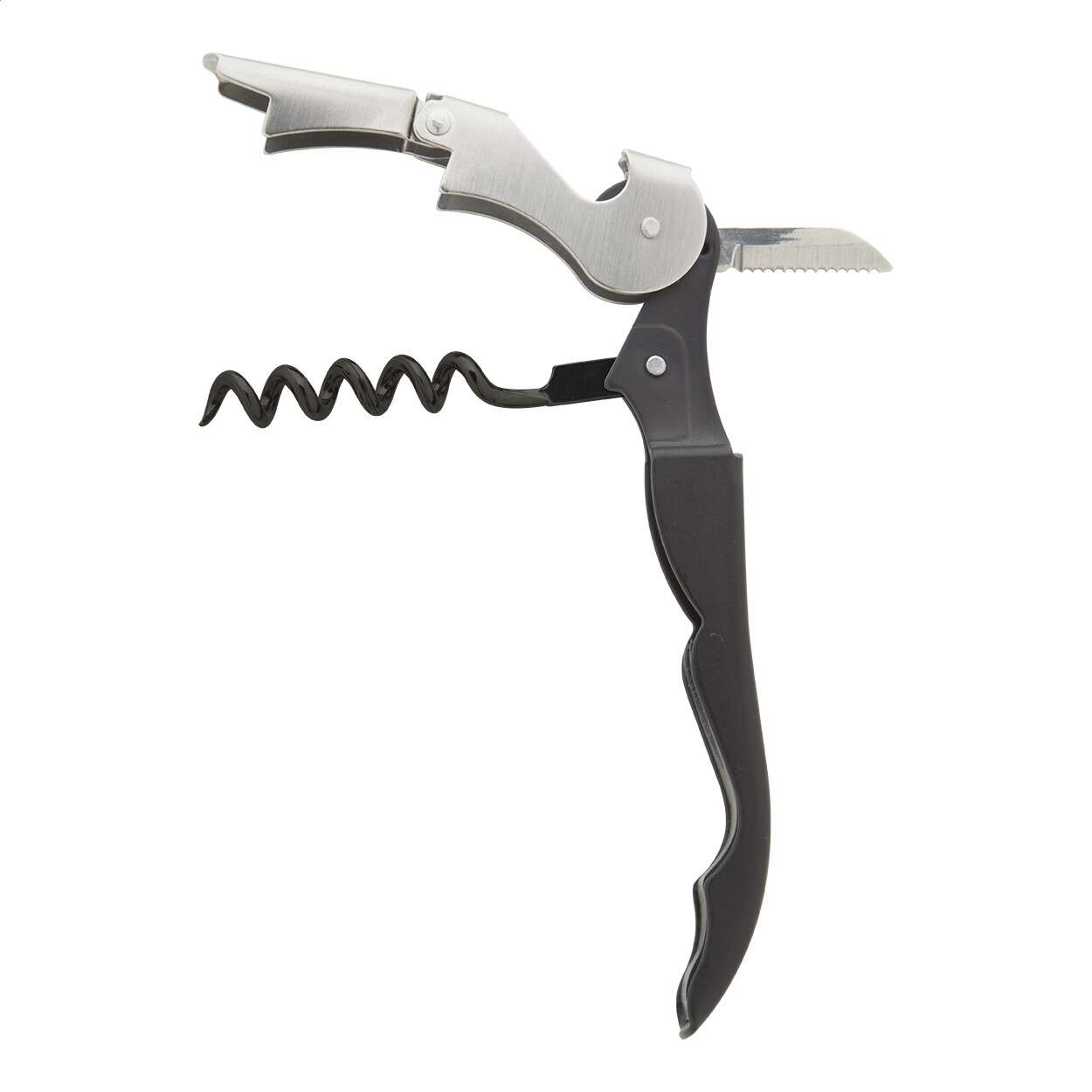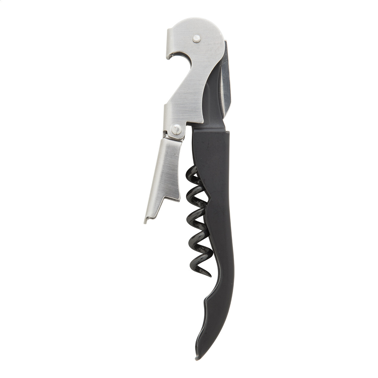 Metal corkscrew with bottle opener.