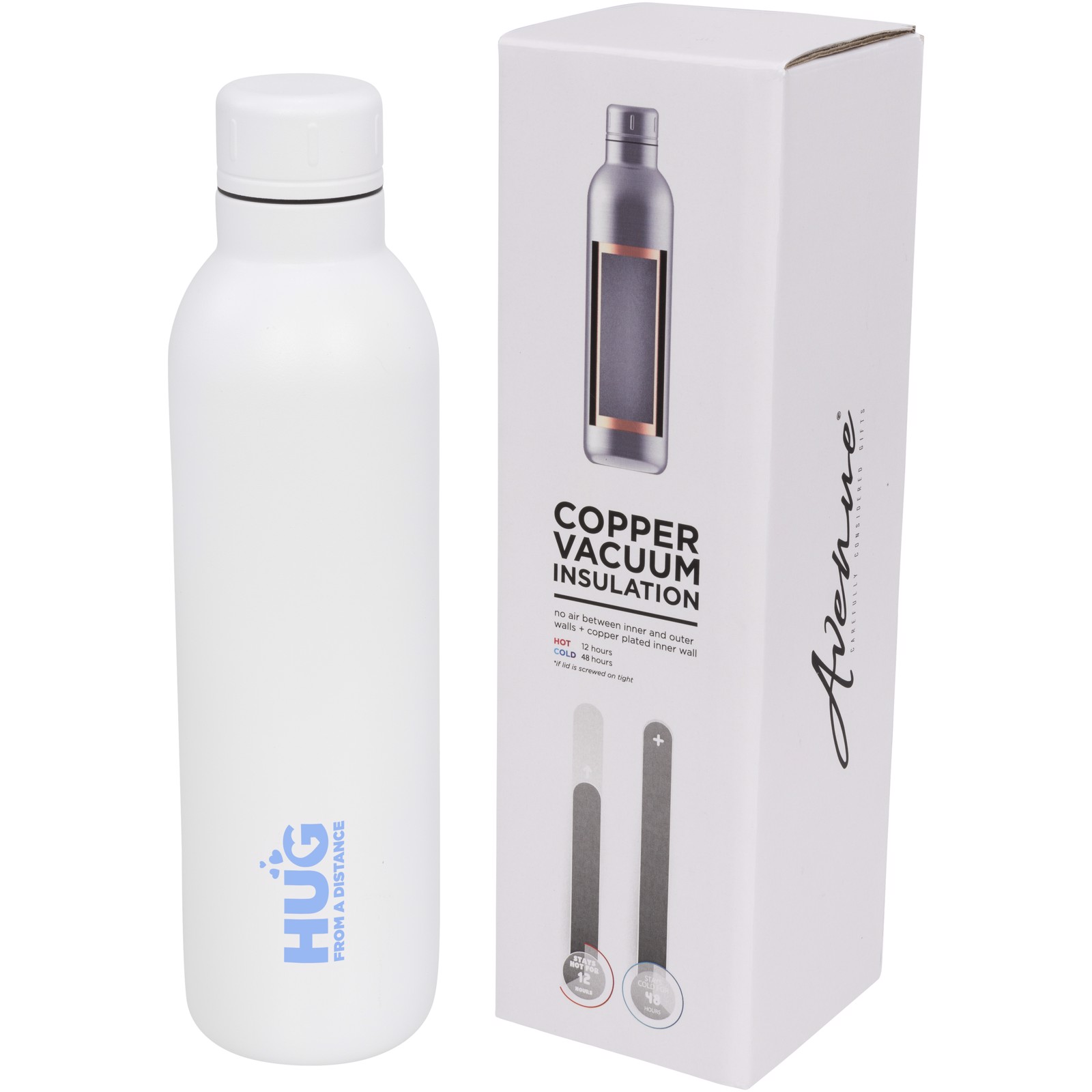 Durable, double wall stainless steel vacuum construction with copper insulation, which allows your beverage to stay cold for 48 hours and at least 12 hours for hot beverages. The construction also prevents condensation on the outside of the bottle. On-trend, durable powder coating. Stainless steel screw-on spill resistant lid. Volume capacity is 510ml. Presented in an Avenue gift box.