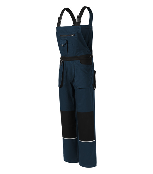 Pružná guma v zadnej časti pásového goliera, zapínanie na gombíky v bočnej časti, traky s elastickým dielom nastaviteľné prackou, 8 multifunkčných vreciek, zdvojený materiál v oblasti kolien a sedu, plastové "D" pútko a karabína na kľúče a ID karty, pútko na kladivo, dvojté prešitie pre vyššiu odolnosť, retroreflexné prvky