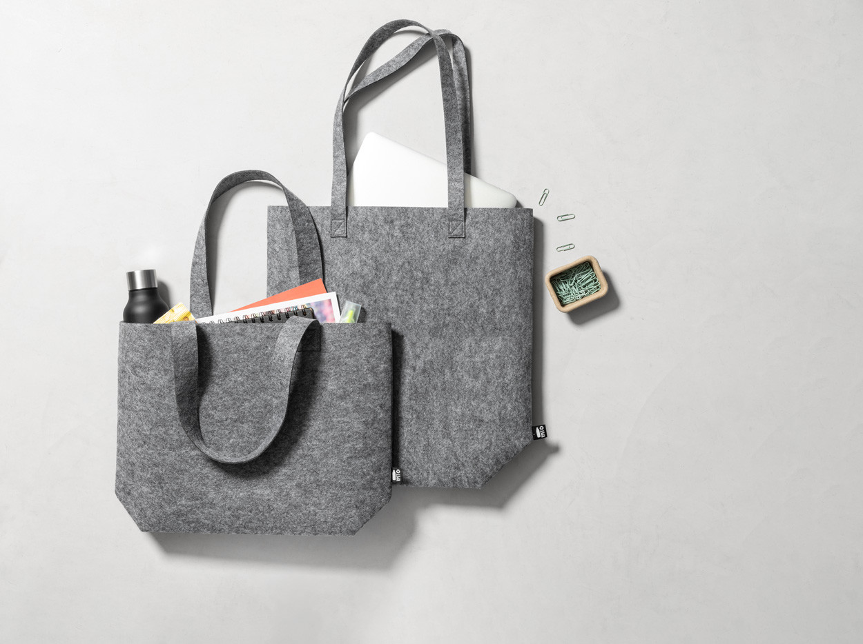 Nákupná taška z RPET filcu s extra dlhými ušami a rozšíreným dnom. S výrazným štítkom RPET.
