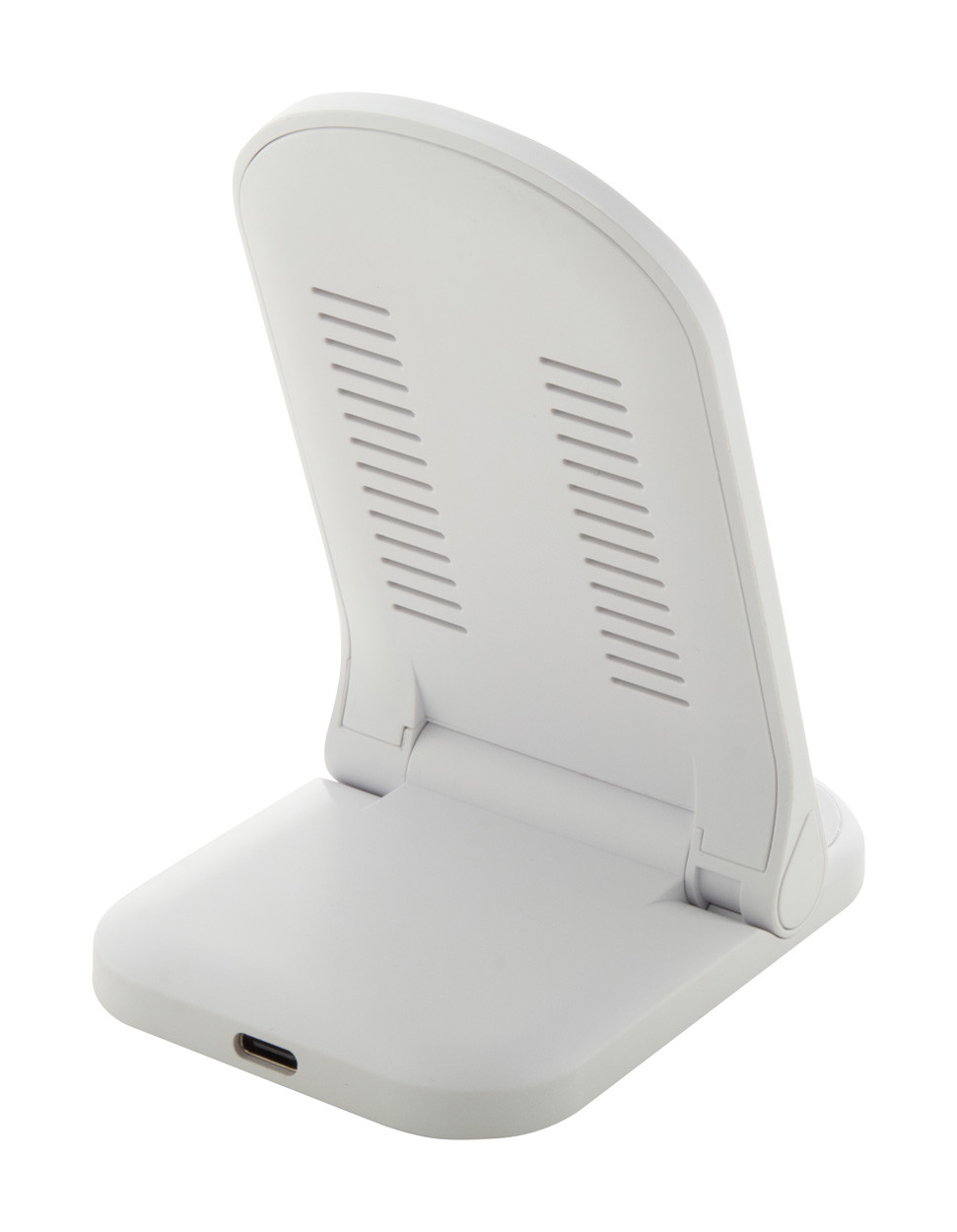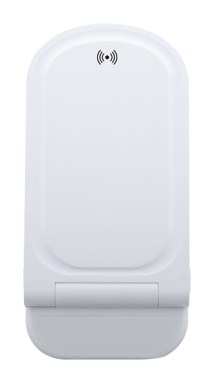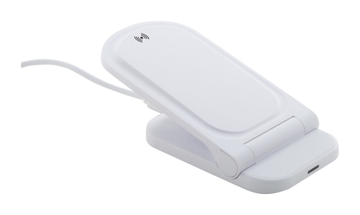 Skladací, nastaviteľný stojanček na mobil z recyklovaného ABS plastu, so zabudovanou bezdrôtovou rýchlonabíjačkou (15W). Vrátane USB nabíjacieho kábla.